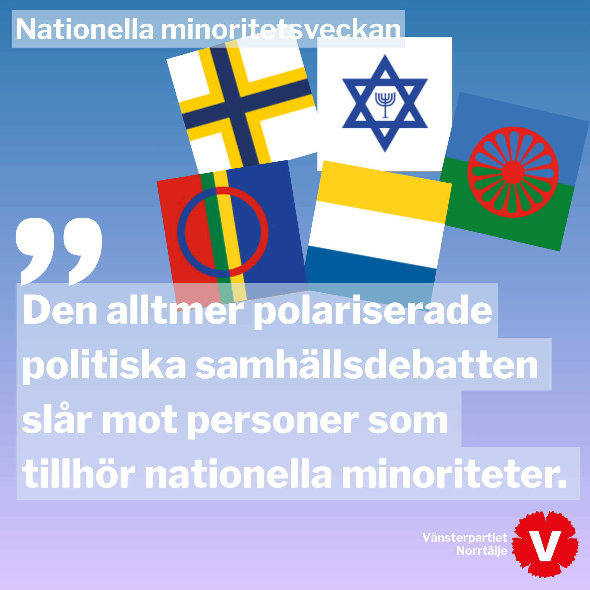 Den alltmer polariserade politiska samhällsdebatten slår mot personer som tillhör nationella minoriteter. Särskilt judar, romer och samer drabbas av den ökande rasismen. Europarådet vill att Sverige ska hantera detta klimat av ökad intolerans skyndsamt. Vi i Vänsterpartiet anser att politiken regeringen för snarare riskerar att förvärra problemen och lämnade därför in en riksdagsmotion förra året och höjde anslagen i årets skuggbudget för att stärka minoritetspolitiken. Motionen innehåller förslag som: